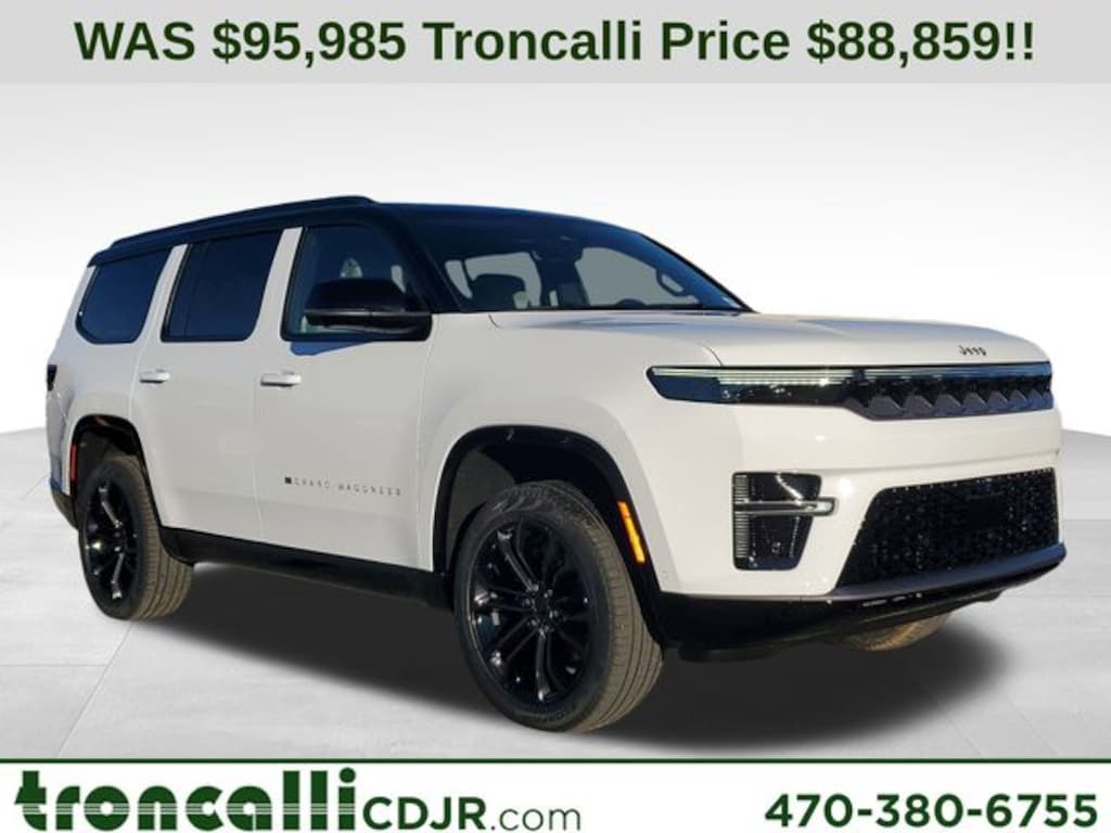 Included features are Obsidian Appearance Package, Quick Order Package 29Z Obsidian (Black Chiseled Metal Interior Accent, Black Exterior Accents, Titanium Daylight Opening Upper, Titanium Upper Grille Applique, and Wheels: 22" x 9" Tinted Polished with Black Insert), Two Tone Paint Group, 118 Mph Maximum Speed Calibration, 19 Speakers, 3.55 Rear Axle Ratio, 3rd row seats: bench, 4-Wheel Disc Brakes, ABS brakes, Adaptive suspension, Air Conditioning, Alloy wheels, AM/FM radio: SiriusXM with 360L, Anti-whiplash front head restraints, Apple CarPlay/Android Auto, Audio memory, Auto Adjust in Reverse Exterior Mirrors, Auto High-beam Headlights, Auto-dimming door mirrors, Auto-Dimming Exterior Driver Mirror, Auto-dimming Rear-View mirror, Auto-leveling suspension, Automatic temperature control, Brake assist, Bumpers: body-color, Compass, Delay-off headlights, Driver door bin, Driver vanity mirror, Driver's Seat Mounted Armrest, Dual front impact airbags, Dual front side impact airbags, Electronic Stability Control, Emergency communication system: Jeep Connect, Exterior Mirrors Approach Lamps, Exterior Mirrors with Memory, Exterior Mirrors with Supplemental Signals, Exterior Parking Camera Rear, Four wheel independent suspension, Front anti-roll bar, Front Bucket Seats, Front Center Armrest w/Storage, Front dual zone A/C, Front fog lights, Front reading lights, Fully automatic headlights, Garage door transmitter, Heads-Up Display, Heated door mirrors, Heated Exterior Mirrors, Heated front seats, Heated rear seats, Heated steering wheel, Illuminated entry, Knee airbag, Leather steering wheel, Leather Trimmed Bucket Seats, Low tire pressure warning, Memory seat, Navigation System, Normal Duty Suspension, Occupant sensing airbag, Outside temperature display, Overhead airbag, Overhead console, Panic alarm, Passenger door bin, Passenger seat mounted armrest, Passenger vanity mirror, Power adjustable front head restraints, Power door mirrors, Power driver seat, Power Liftgate, Power moonroof, Power passenger seat, Power steering, Power windows, Radio data system, Radio: Uconnect 5 Nav with 12.0" Display, Rain sensing wipers, Rear air conditioning, Rear anti-roll bar, Rear dual zone A/C, Rear reading lights, Rear seat center armrest, Rear window defroster, Rear window wiper, Reclining 3rd row seat, Remote keyless entry, Security system, Speed control, Speed-sensing steering, Speed-Sensitive Wipers, Split folding rear seat, Steering wheel memory, Steering wheel mounted audio controls, Tachometer, Telescoping steering wheel, Tilt steering wheel, Traction control, Trip computer, Turn signal indicator mirrors, Variably intermittent wipers, Ventilated front seats, Ventilated rear seats, and Voltmeter. Price includes the following rebates:$1000 - 2026 National Stellantis Loyalty Bonus Cash . Exp. 03/31/2026 $500 - 2026 National 2026 Military Bonus Cash . Exp. 01/04/2027