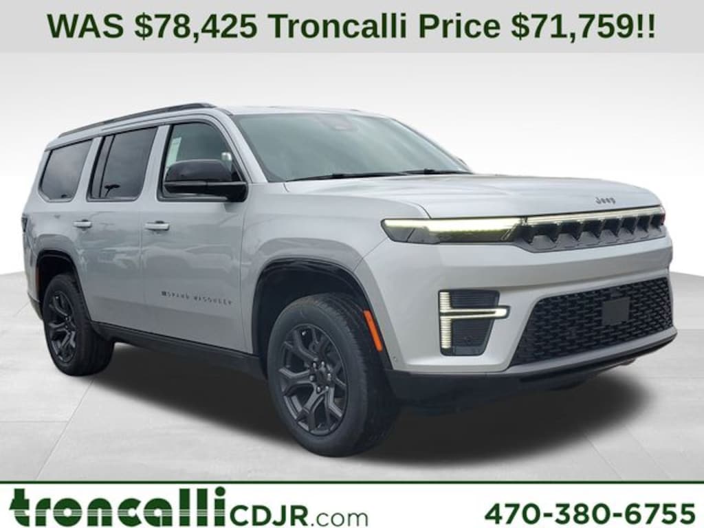 Included features are Altitude Appearance Package, Premium Group II (19 Speaker McIntosh Audio System, 3 Panel Sunroof, Cargo Cover, Interior Rear Facing Camera, Luxury Front and Rear Floor Mats, Power Deployable Running Boards, and Reversible Carpet/Vinyl Cargo Mat), Quick Order Package 29X Altitude (Black Exterior Accents, Titanium Daylight Opening Upper, Titanium Upper Grille Applique, and Wheels: 20" x 9" Aluminum Painted), 118 Mph Maximum Speed Calibration, 3.55 Rear Axle Ratio, 3rd row seats: bench, 4-Wheel Disc Brakes, 9 Speakers, ABS brakes, Air Conditioning, Alloy wheels, AM/FM radio: SiriusXM with 360L, Anti-whiplash front head restraints, Apple CarPlay/Android Auto, Audio memory, Auto Adjust in Reverse Exterior Mirrors, Auto High-beam Headlights, Auto-dimming door mirrors, Auto-Dimming Exterior Driver Mirror, Auto-dimming Rear-View mirror, Auto-leveling suspension, Automatic temperature control, Brake assist, Bumpers: body-color, Compass, Delay-off headlights, Driver door bin, Driver vanity mirror, Driver's Seat Mounted Armrest, Dual front impact airbags, Dual front side impact airbags, Electronic Stability Control, Emergency communication system: Jeep Connect, Exterior Mirrors Approach Lamps, Exterior Mirrors with Memory, Exterior Mirrors with Supplemental Signals, Exterior Parking Camera Rear, Four wheel independent suspension, Front anti-roll bar, Front Bucket Seats, Front Center Armrest w/Storage, Front dual zone A/C, Front fog lights, Front reading lights, Fully automatic headlights, Garage door transmitter, Heated door mirrors, Heated Exterior Mirrors, Heated front seats, Heated rear seats, Heated steering wheel, Illuminated entry, Knee airbag, Leather Trimmed Bucket Seats, Low tire pressure warning, Memory seat, Navigation System, Normal Duty Suspension, Occupant sensing airbag, Outside temperature display, Overhead airbag, Overhead console, Panic alarm, Passenger door bin, Passenger seat mounted armrest, Passenger vanity mirror, Power door mirrors, Power driver seat, Power Liftgate, Power passenger seat, Power steering, Power windows, Radio data system, Radio: Uconnect 5 Nav with 12.0" Display, Rain sensing wipers, Rear air conditioning, Rear anti-roll bar, Rear reading lights, Rear seat center armrest, Rear window defroster, Rear window wiper, Reclining 3rd row seat, Remote keyless entry, Security system, Speed control, Speed-sensing steering, Speed-Sensitive Wipers, Split folding rear seat, Steering wheel memory, Steering wheel mounted audio controls, Tachometer, Telescoping steering wheel, Tilt steering wheel, Traction control, Trip computer, Turn signal indicator mirrors, Variably intermittent wipers, Ventilated front seats, Ventilated rear seats, and Voltmeter. Price includes the following rebates:$1000 - 2026 National Stellantis Loyalty Bonus Cash . Exp. 04/30/2026 $500 - 2026 National 2026 Military Bonus Cash . Exp. 01/04/2027