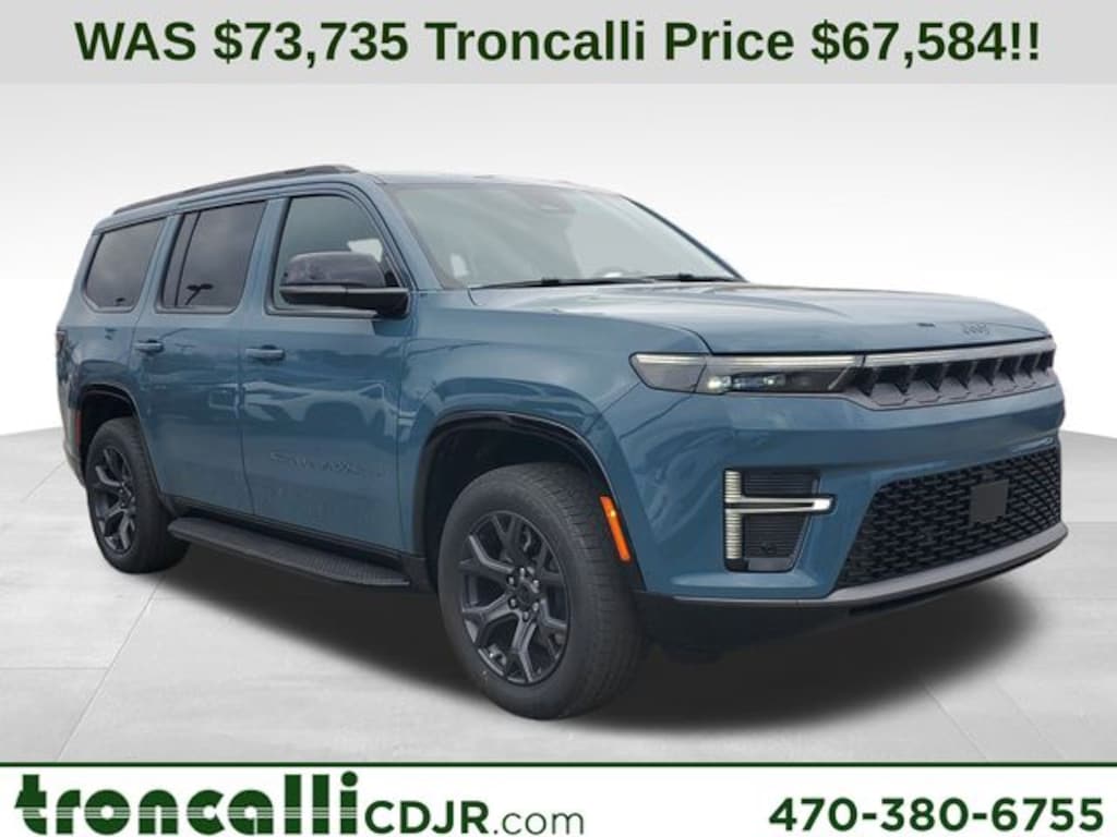 Included features are Altitude Appearance Package, Quick Order Package 29X Altitude (Black Exterior Accents, Titanium Daylight Opening Upper, Titanium Upper Grille Applique, and Wheels: 20" x 9" Aluminum Painted), 118 Mph Maximum Speed Calibration, 3.55 Rear Axle Ratio, 3rd row seats: bench, 4-Wheel Disc Brakes, 9 Speakers, ABS brakes, Air Conditioning, Alloy wheels, AM/FM radio: SiriusXM with 360L, Anti-whiplash front head restraints, Apple CarPlay/Android Auto, Audio memory, Auto Adjust in Reverse Exterior Mirrors, Auto High-beam Headlights, Auto-dimming door mirrors, Auto-Dimming Exterior Driver Mirror, Auto-dimming Rear-View mirror, Auto-leveling suspension, Automatic temperature control, Brake assist, Bumpers: body-color, Compass, Delay-off headlights, Driver door bin, Driver vanity mirror, Driver's Seat Mounted Armrest, Dual front impact airbags, Dual front side impact airbags, Electronic Stability Control, Emergency communication system: Jeep Connect, Exterior Mirrors Approach Lamps, Exterior Mirrors with Memory, Exterior Mirrors with Supplemental Signals, Exterior Parking Camera Rear, Four wheel independent suspension, Front anti-roll bar, Front Bucket Seats, Front Center Armrest w/Storage, Front dual zone A/C, Front fog lights, Front reading lights, Fully automatic headlights, Garage door transmitter, Heated door mirrors, Heated Exterior Mirrors, Heated front seats, Heated rear seats, Heated steering wheel, Illuminated entry, Knee airbag, Leather Trimmed Bucket Seats, Low tire pressure warning, Memory seat, Navigation System, Normal Duty Suspension, Occupant sensing airbag, Outside temperature display, Overhead airbag, Overhead console, Panic alarm, Passenger door bin, Passenger seat mounted armrest, Passenger vanity mirror, Power door mirrors, Power driver seat, Power Liftgate, Power passenger seat, Power steering, Power windows, Radio data system, Radio: Uconnect 5 Nav with 12.0" Display, Rain sensing wipers, Rear air conditioning, Rear anti-roll bar, Rear reading lights, Rear seat center armrest, Rear window defroster, Rear window wiper, Reclining 3rd row seat, Remote keyless entry, Security system, Speed control, Speed-sensing steering, Speed-Sensitive Wipers, Split folding rear seat, Steering wheel memory, Steering wheel mounted audio controls, Tachometer, Telescoping steering wheel, Tilt steering wheel, Traction control, Trip computer, Turn signal indicator mirrors, Variably intermittent wipers, Ventilated front seats, Ventilated rear seats, and Voltmeter. Price includes the following rebates:$1000 - 2026 National Stellantis Loyalty Bonus Cash . Exp. 04/30/2026 $500 - 2026 National 2026 Military Bonus Cash . Exp. 01/04/2027