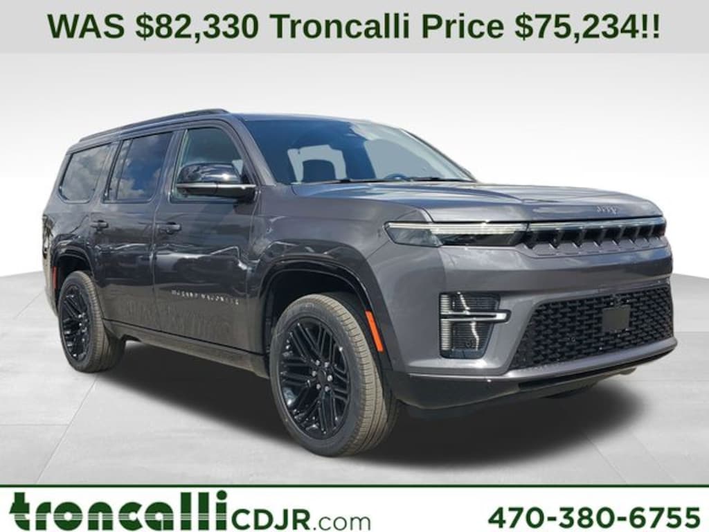 Included features are Black Appearance Package (118 Mph Maximum Speed Calibration, Black Exterior Accents, Titanium Daylight Opening Upper, Titanium Upper Grille Applique, and Wheels: 22" x 9" Painted Gloss Black), Limited Reserve Package, Quick Order Package 29D Reserve (19 Speaker McIntosh Audio System, 2nd Row Manual Window Shades, 3 Panel Sunroof, Augmented HUD, Cargo Cover, Cluster 12" TFT Color Display, Instrument Panel, Interior Rear Facing Camera, Luxury Front and Rear Floor Mats, P and P Park and Unpark Assist with Stop System, Power Deployable Running Boards, Quadra-Lift Air Suspension, Reversible Carpet/Vinyl Cargo Mat, Semi Active Damping, Side Distance Warning, Smartphone as a Key Prep, and Surround View Camera System), 3.55 Rear Axle Ratio, 3rd row seats: bench, 4-Wheel Disc Brakes, 9 Speakers, ABS brakes, Air Conditioning, Alloy wheels, AM/FM radio: SiriusXM with 360L, Anti-whiplash front head restraints, Apple CarPlay/Android Auto, Audio memory, Auto Adjust in Reverse Exterior Mirrors, Auto High-beam Headlights, Auto-dimming door mirrors, Auto-Dimming Exterior Driver Mirror, Auto-dimming Rear-View mirror, Auto-leveling suspension, Automatic temperature control, Brake assist, Bumpers: body-color, Compass, Delay-off headlights, Driver door bin, Driver vanity mirror, Driver's Seat Mounted Armrest, Dual front impact airbags, Dual front side impact airbags, Electronic Stability Control, Emergency communication system: Jeep Connect, Exterior Mirrors Approach Lamps, Exterior Mirrors with Memory, Exterior Mirrors with Supplemental Signals, Exterior Parking Camera Rear, Four wheel independent suspension, Front anti-roll bar, Front Bucket Seats, Front Center Armrest w/Storage, Front dual zone A/C, Front fog lights, Front reading lights, Fully automatic headlights, Garage door transmitter, Heated door mirrors, Heated Exterior Mirrors, Heated front seats, Heated rear seats, Heated steering wheel, Illuminated entry, Knee airbag, Leather Trimmed Bucket Seats, Low tire pressure warning, Memory seat, Navigation System, Normal Duty Suspension, Occupant sensing airbag, Outside temperature display, Overhead airbag, Overhead console, Panic alarm, Passenger door bin, Passenger seat mounted armrest, Passenger vanity mirror, Power door mirrors, Power driver seat, Power Liftgate, Power passenger seat, Power steering, Power windows, Radio data system, Radio: Uconnect 5 Nav with 12.0" Display, Rain sensing wipers, Rear air conditioning, Rear anti-roll bar, Rear reading lights, Rear seat center armrest, Rear window defroster, Rear window wiper, Reclining 3rd row seat, Remote keyless entry, Security system, Speed control, Speed-sensing steering, Speed-Sensitive Wipers, Split folding rear seat, Steering wheel memory, Steering wheel mounted audio controls, Tachometer, Telescoping steering wheel, Tilt steering wheel, Traction control, Trip computer, Turn signal indicator mirrors, Variably intermittent wipers, Ventilated front seats, Ventilated rear seats, Voltmeter, and Wheels: 20" x 9" Aluminum Painted. Price includes the following rebates:$1000 - 2026 National Stellantis Loyalty Bonus Cash . Exp. 04/30/2026 $500 - 2026 National 2026 Military Bonus Cash . Exp. 01/04/2027