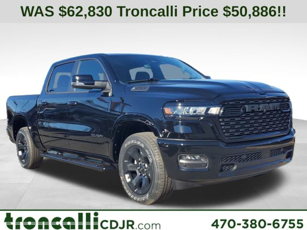 Included features are Bed Utility Group (Exterior 115V AC Outlet, MOPAR 4 Adjustable Cargo Tie-Down Hooks, MOPAR Spray in Bedliner, and Pick-Up Box Lighting), Big Horn Level 2 Equipment Group (115V Auxiliary Power Outlet, 115V Auxiliary Rear Power Outlet, 12" Touchscreen Display, 2nd Row in Floor Storage Bins, 3 Rear Seat Head Restraints, 4 Way Front Headrests, 400W Inverter, 4G LTE Wi-Fi Hot Spot, 9 Amplified Speakers with Subwoofer, Air Conditioning ATC with Dual Zone Control, Apple CarPlay, Auto Power-Folding Mirrors, Auto-Dimming Exterior Driver Mirror, Auto-Dimming Rear-View Mirror, Black Exterior Mirrors, Black Premium Power Mirrors, Body Color Fender Flares, Bucket Seats, Center Console Parts Module, Cluster 7.0" TFT Color Display, Configurable Drive Mode, Connected Travel and Traffic Services, Connectivity - US/Canada, Convex Wide-Angle Exterior Mirror Insert, Deluxe Cloth Bucket Seats, Disassociated Touchscreen Display, Exterior Mirrors Courtesy Lamps, Exterior Mirrors with Heating Element, Exterior Mirrors with Supplemental Signals, Front Seat Back Map Pockets, Full Length Floor Console, Global Telematics Box Module, Glove Box Lamp, Google Android Auto, GPS Antenna Input, GPS Navigation, HD Radio, Heated Front Seats, Heated Steering Wheel, Integrated Center Stack Radio, Integrated Voice Command with Bluetooth, Leather Wrapped Steering Wheel, LED Dome Lamp with on/Off Switch, LED Footwell Lighting, Manual Adjust 4-Way Front Passenger Seat, Media Hub with 2 Charge Only USBs, Overhead LED Lamps, Power 2-Way Driver Lumbar Adjust, Power Adjust 8-Way Driver Seat, Power Adjustable Pedals, Premium Overhead Console, Radio: Uconnect 5 Navigation with 12.0" Display, Rear 60/40 Folding Seat, Rear Center Armrest, Rear Power Sliding Window, Rear Window Defroster, Remote Tailgate Release, Security Alarm, SiriusXM Radio Service, SiriusXM with 360L, Steering Wheel Mounted Audio Controls, Sun Visors with Illuminated Vanity Mirrors, Universal Garage Door Opener, and USB Host Flip), Night Edition (Accent Color Door Handles, Accent Color Premium Power Mirrors, Accent Color Tailgate Handle, Anti-Spin Differential Rear Axle, Black Exterior Truck Badging, Black Headlamp Bezels, Black Interior Accents, Black Painted Exterior Mirrors Caps, Black Tail Lamp Bezels, Body Color Front Bumper, Body Color Rear Bumper with Step Pads, Dual Exhaust with Black Tips, Grille Black Surround Black Mesh, RAM Grille Badge - Black, and Wheels: 20" x 9.0" Aluminum Painted Clad), Quick Order Package 21Z Big Horn, Quick Order Package 23Z Big Horn, 4-Wheel Disc Brakes, 48V Belt Starter Generator, 6 Speakers, ABS brakes, Air Conditioning, Alloy wheels, AM/FM radio, Apple CarPlay/Android Auto, Auto High-beam Headlights, Brake assist, Bumpers: chrome, Cloth Bucket Seats, Compass, Delay-off headlights, Driver door bin, Dual front impact airbags, Dual front side impact airbags, Electronic Stability Control, Front anti-roll bar, Front Bucket Seats, Front Center Armrest w/Storage, Front fog lights, Front reading lights, Front wheel independent suspension, Fully automatic headlights, Heated door mirrors, Illuminated entry, Low tire pressure warning, Manual Adjust 4-Way Driver Seat, Manual Folding Exterior Mirrors, MOPAR Front and Rear Rubber Floor Mats, MyFlexCare Service Plan, Occupant sensing airbag, Outside temperature display, Overhead airbag, Overhead console, Panic alarm, ParkView Rear Back-Up Camera, Passenger door bin, Passenger vanity mirror, Power door mirrors, Power steering, Power windows, Radio data system, Radio: Uconnect 5 W with 8.4" Display, RAM Grille Badge - Chrome, Rear anti-roll bar, Rear step bumper, Rear Underseat Compartment Storage, Price includes the following rebates:$2000 - 2026 National SFS Lease Loyalty Bonus Cash . Exp. 03/31/2026 $3500 - 2026 National Retail Bonus Cash . Exp. 03/31/2026 $500 - 2026 National 2026 Military Bonus Cash . Exp. 01/0